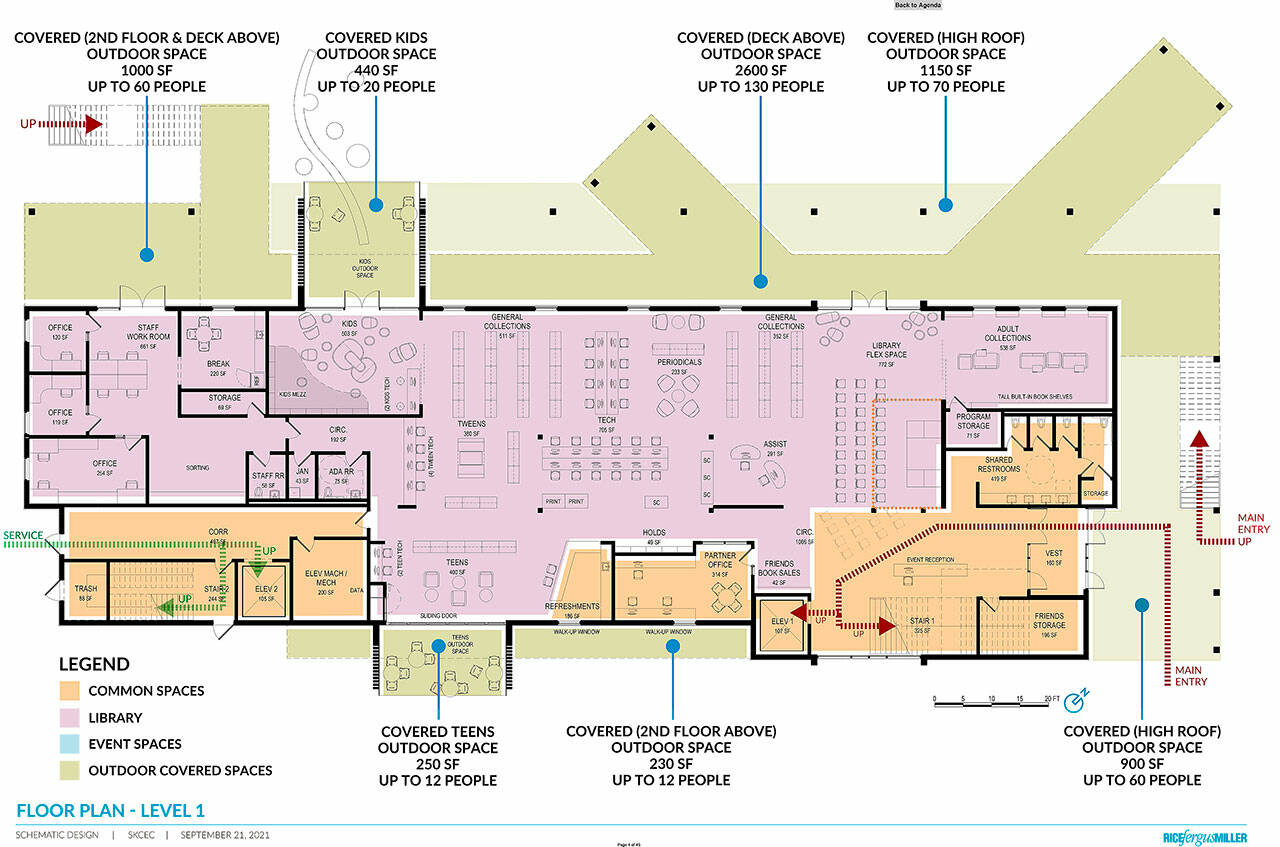 Within that shared space is a partner office for the building’s operations manager and a refreshments area — a place where coffee could be available and space for people to gather and chat. The design change for the entrance, project manager Lorie Limson Cook said, eliminates any confusion as to how to get to the library or the events space on the second floor. The restrooms also are now easily located from the entrance.