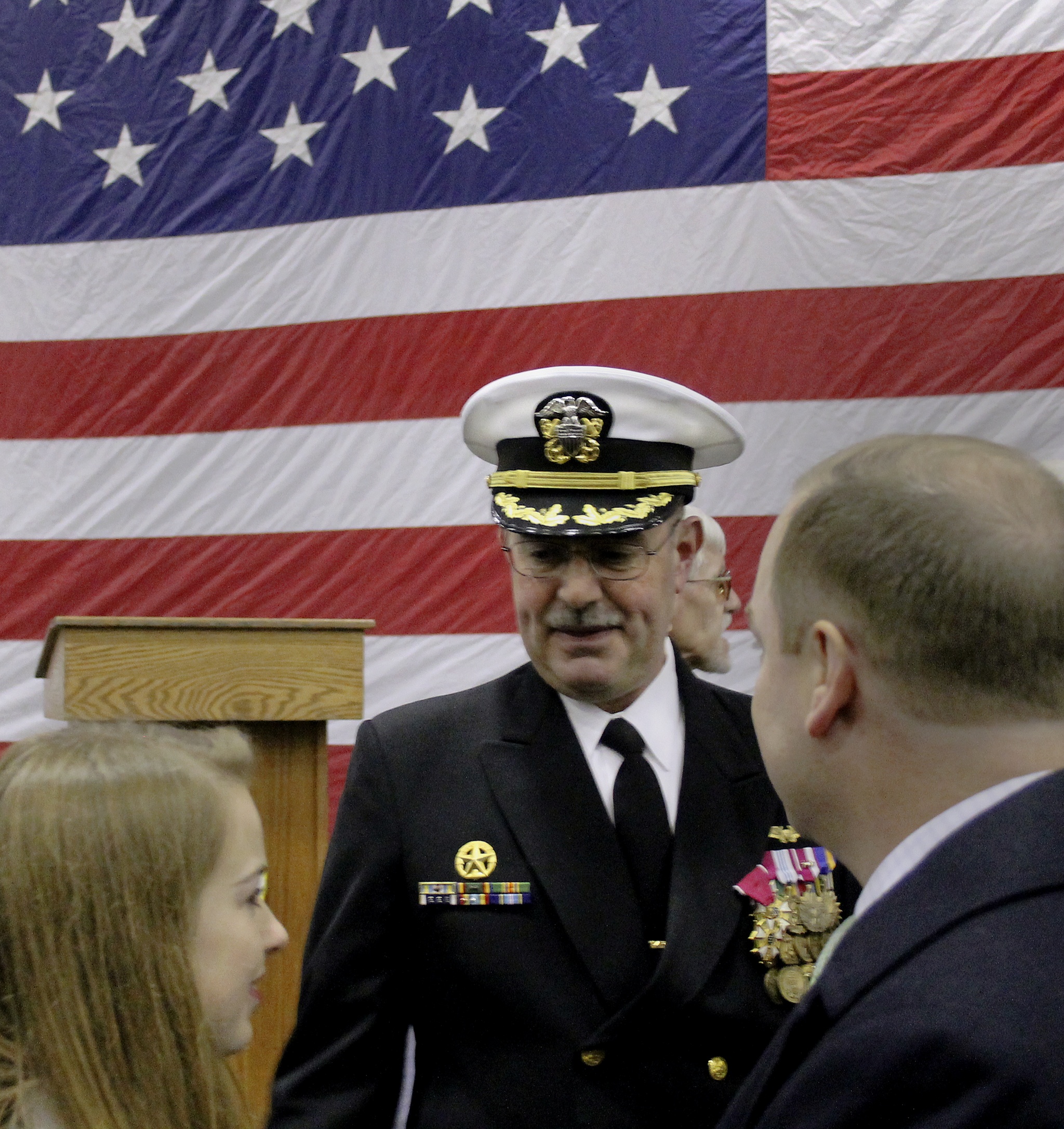 White-gloved officers with their medals and sabers, chiefs with their medals and cutlasses, local dignitaries, admirals, and family members took their places.
