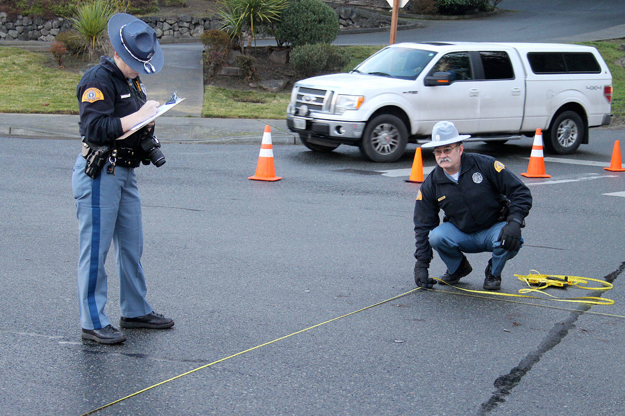 Washington State Patrol troopers collect evidence at the site where a woman was struck by a car, Dec. 15 in the crosswalk at Front Street and Torval Canyon Road. (Richard Walker/Kitsap News Group)