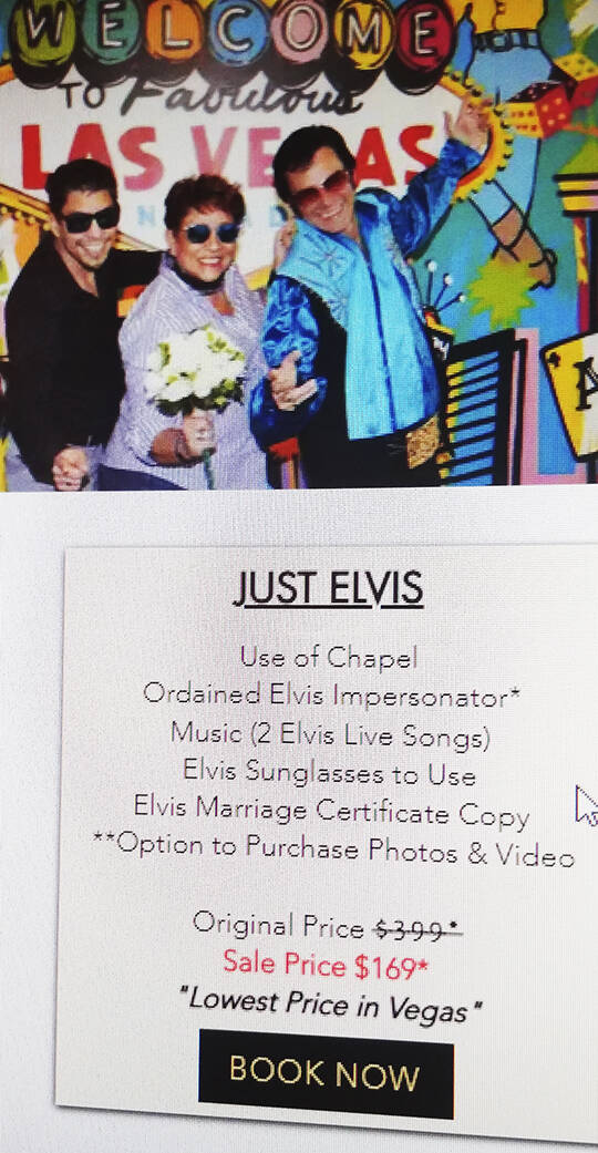 When I signed up online it said the package included Elvis, the chapel, two Elvis songs, Elvis sunglasses and an Elvis marriage certificate. When you go to the asterisk, lower on the page it says, “Lowest Price in Vegas” at $169.