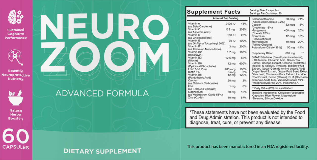 NeuroZoom is designed for convenience, packaged in an easy-to-swallow capsule format. Each bottle contains a total of 60 capsules. For optimal benefits, users are advised to take two capsules daily, accompanied by an 8 oz glass of water.
