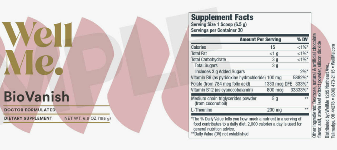 | BioVanish™ Ingredients | Vitamin B12, Medium Chain Triglycerides Powder derived from coconut oil, folate, vitamin B6, and L-theanine. |