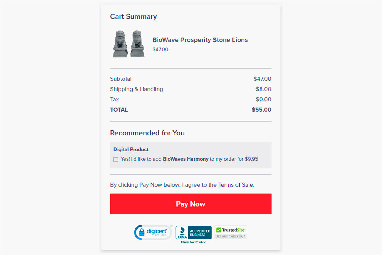 The BioWave Prosperity Stone Lions are sold online by a company named BioWaves Energy Sanctuary.