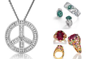 From left, clockwise: Peace sign pendant, ‘Exuma’ collection and ‘Amore’ ring – featuring a 14.8 ct Umbalite cushion garnet in 14 k yellow gold and 2.57 cts of AA amethyst, AA citrine, AAA tsavorite garnet, AA ruby, AA pink and yellow sapphire, and AA London blue topaz.