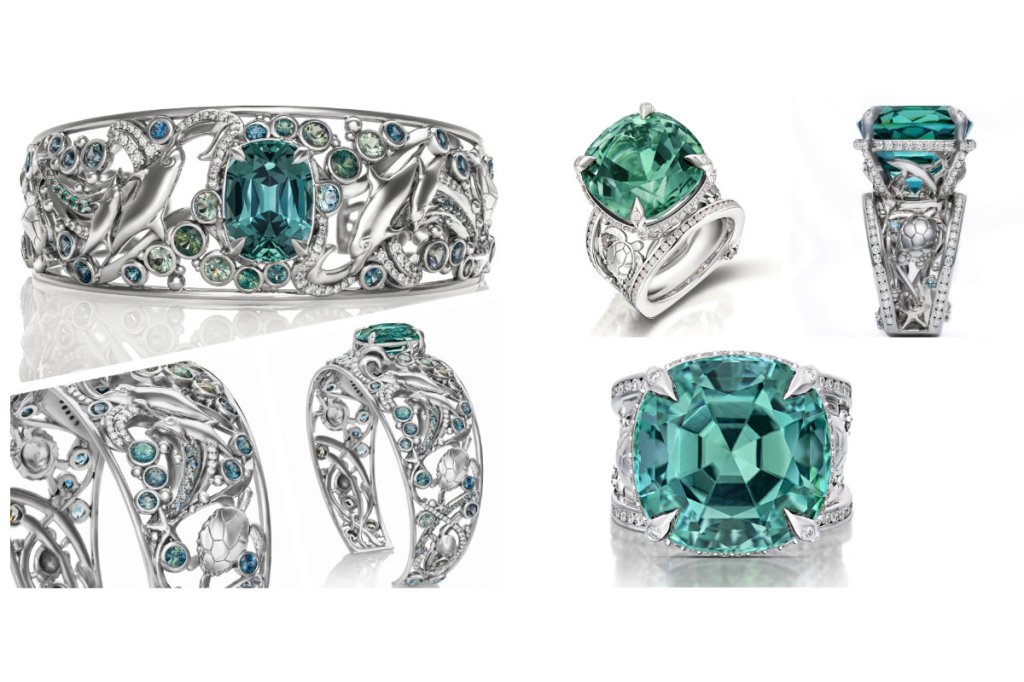 Among this year’s celebrated designs was Exuma, an ocean-inspired ring curated as part of an exclusive collection for Palm Beach Gems by Nicole. Centred around a striking 25.85-carat Cuprian color-changing tourmaline, the piece weaves subtle sea life into the design, with delicate ocean motifs playfully worked into the setting.