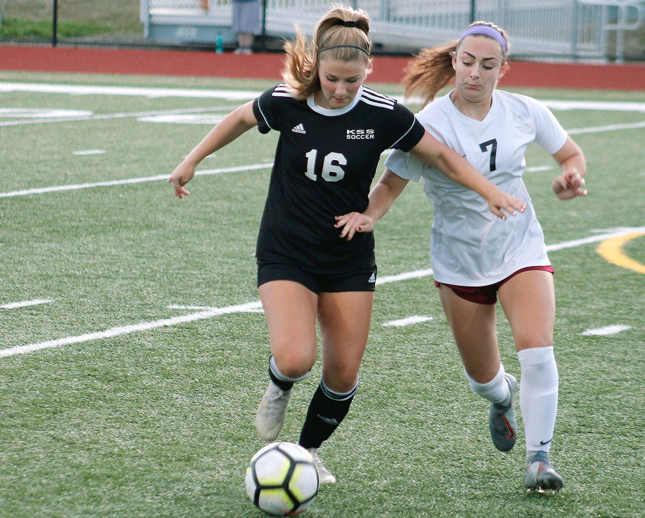 Klahowya freshman Tori Peters (16) holds off South Kitsap’s Lily Lutovsky. (Mark Krulish/Kitsap News Group)