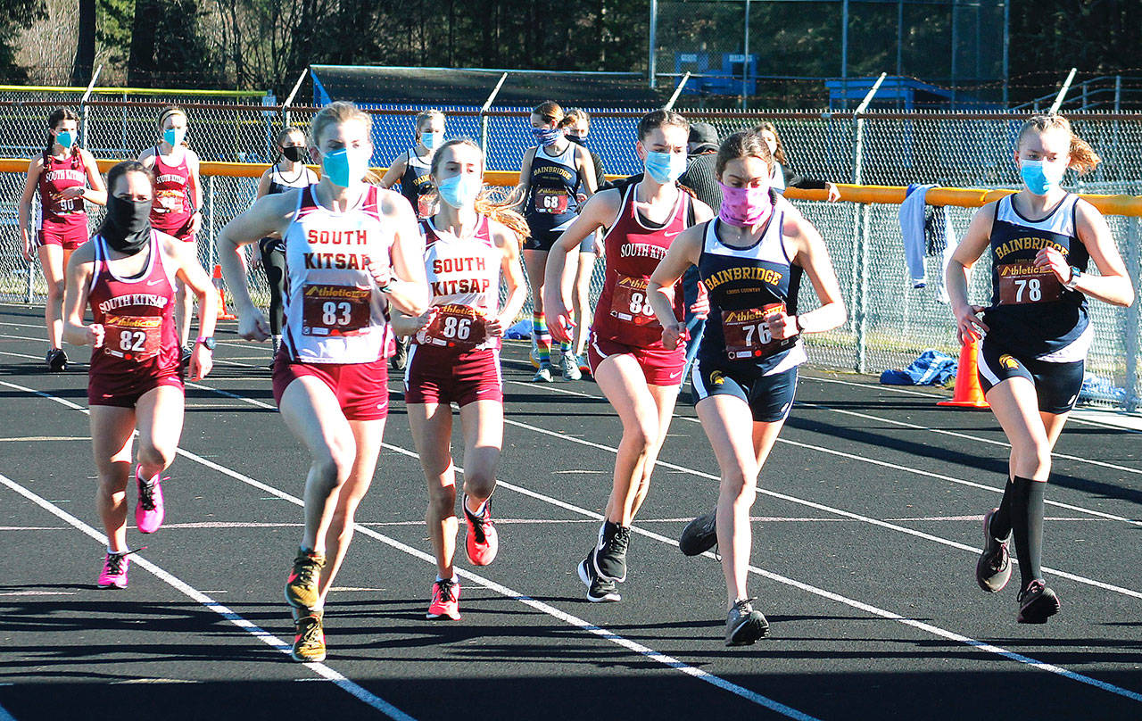 The first wave of South Kitsap and Bainbridge runners take off from the starting line. (Mark Krulish/Kitsap News Group)