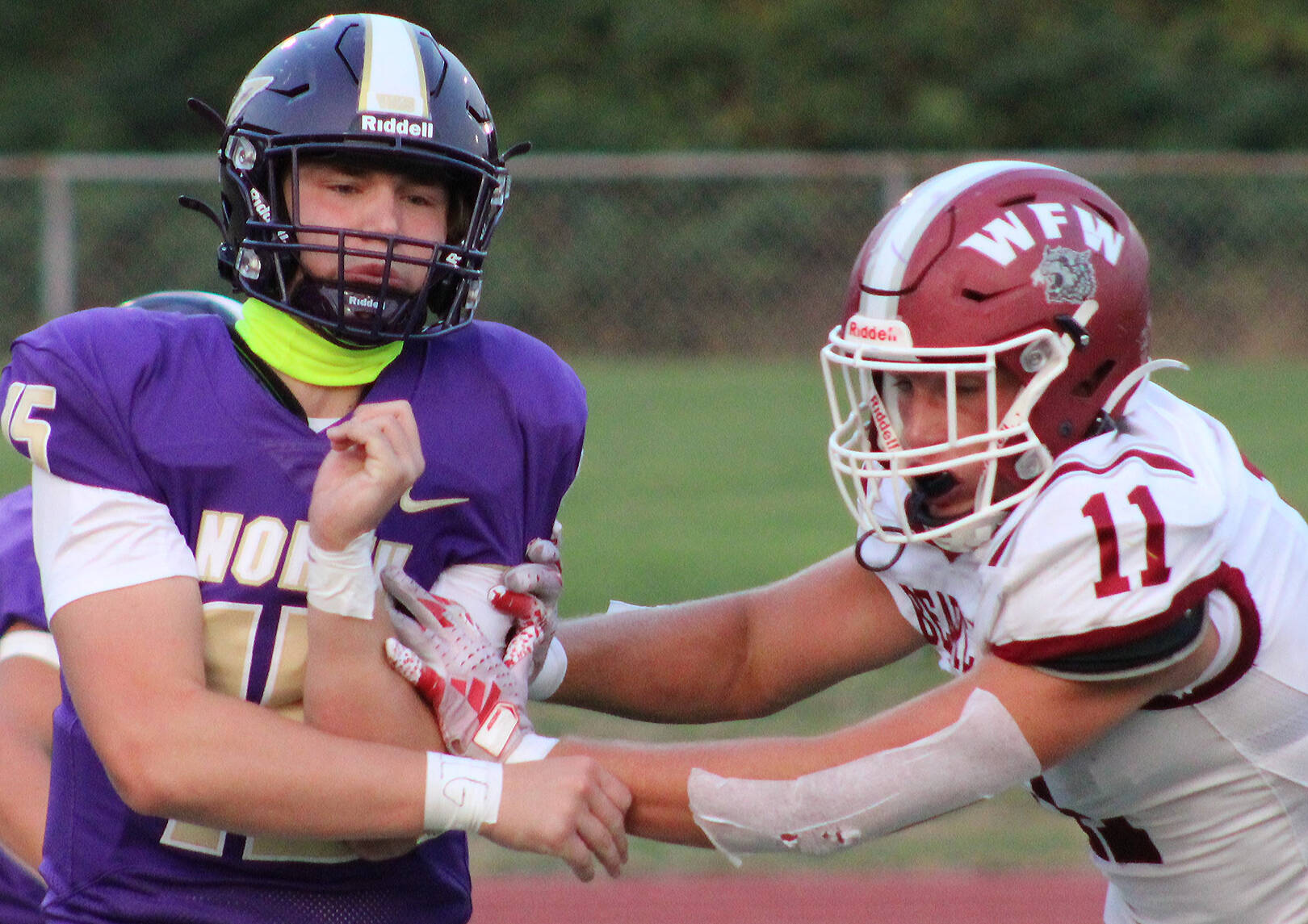 Viking quarterback Dawsyn Anderson finds his target just as the blitz reaches him.