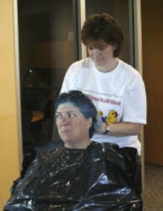 American Marine Bank Silverdale branch manager Mary Hoover sits quietly as bank operations officer Mechelle Hoerer sprays her hair blue. Hoover
