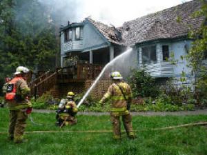 Central Kitsap Fire & Rescue firefighters work to extinguish a fire that erupted in a three-story home on…
