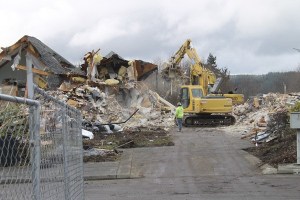 Demolition crews finish tearing apart the vacant building Thursday where Safeway will be built.