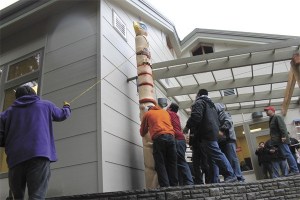 Members of the Port Gamble S’Klallam Tribe raised an honor pole in front of the new early childhood…