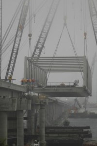 SHINE – Shrouded in fog, the new east truss and draw span pontoons were floated in to the…