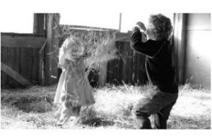 Laurel Williams and Ian Whitney throw hay with childish glee at Sunrise Hill Farm.