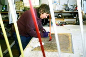 Neon artist Laurie Lewis patiently coaches a newbie in the art of bending glass rods. Fingers of flame…