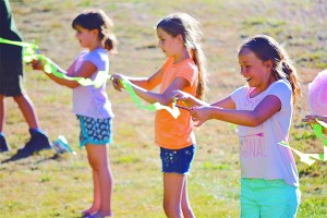 Fifth graders Mylee Miller and Lainey Eubanks cut the ribbon for Olalla Elementary School’s new grass play field.